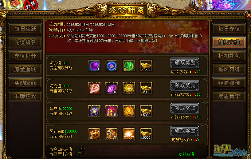 活动内容:活动期间每天充值1000、10000、100000元宝即可领取对应奖励,每个档次奖励限领10次,累计充值达到100W元宝,更可以领取一份超级大奖!