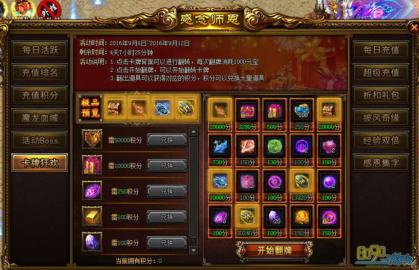 活动内容:1.点击卡牌背面进行翻转,每次翻牌消耗1000元宝。2.点击开始翻牌,可以开始翻转卡牌。3.翻出道具可以获得对应的积分,积分可以兑换大量道具。