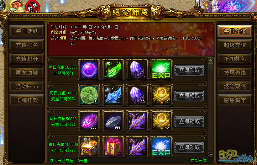 活动内容:活动期间,每天充值一定数量元宝,即可领取豪礼,不要错过哦!