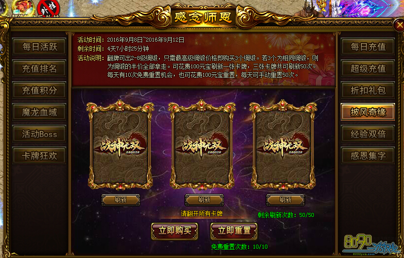 活动内容:翻牌可出2-8级绸缎,只需最高级绸缎价格即可购买3个绸缎。若3个为相同绸缎,则为绸缎半价全部拿走。可花费100元宝刷新一张卡牌,三张卡牌共可刷新50次。每天有10次免费重置机会,也可花费100元宝重置,每天可手动重置50次。