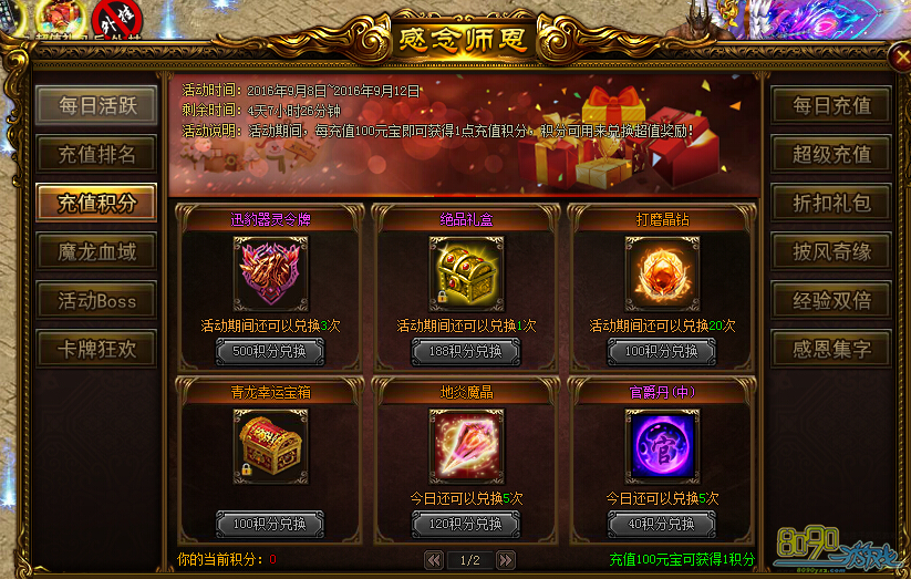 活动内容:活动期间,每充值100元宝即可获得1点充值积分,积分可以用来兑换超值奖励!