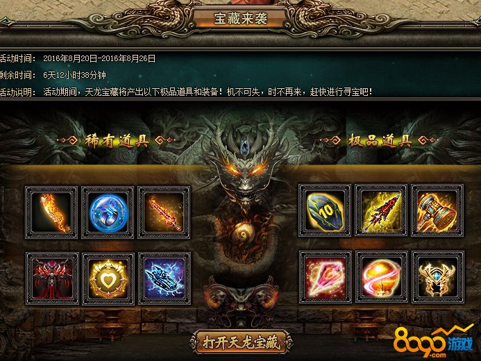活动内容:活动期间,天龙宝藏进行寻宝将有可能获得全新幻化坐骑—光棱坦克以及战天圣龙刀(幻武)、亡灵追魂(幻武)以及战天传奇套装部件等。机不可失,时不再来!