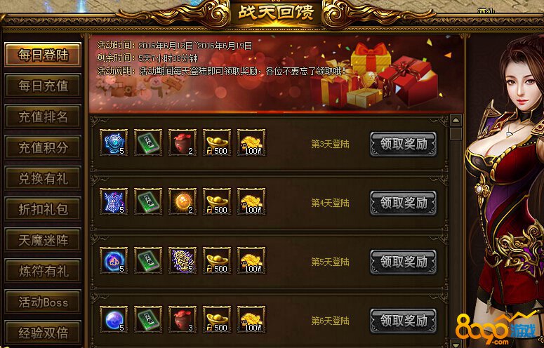 活动内容:活动期间,每天登陆即可领取丰厚奖励。不要忘记领取哦!
