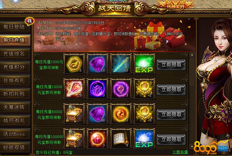 活动内容:活动期间,每天充值一点你给数量元宝,即可领取豪礼,不要错过哦!(1RMB=100元宝)