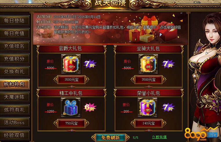 活动内容:活动期间,可花费少量元宝购买超值折扣礼包,低至3折!温馨提示:典籍刷新按钮,刷新所有礼包与折扣。
