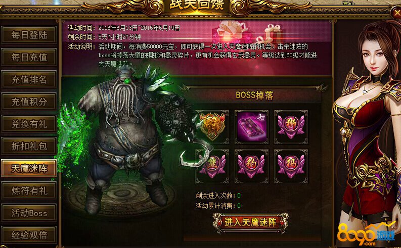 活动内容:活动期间,每消费50000元宝,即可获得一次进入天魔迷阵的机会,击杀迷阵的BOSS将掉落大量的绸缎和器灵碎片,更有机会获得玄武器灵。等级达到60级才能进入天魔迷阵。