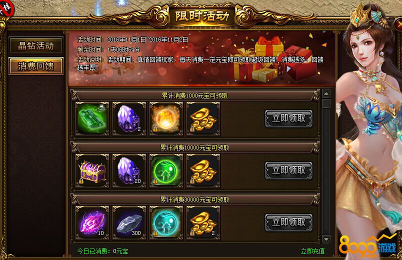 活动期间,真情回馈玩家,每天消费一定元宝即可领取超值回馈!消费越多,回馈越丰厚!