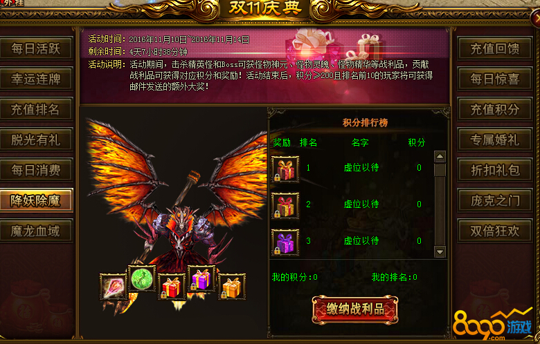活动内容:活动期间,击杀精英怪和BOSS可获怪物神元、怪物灵魂、怪物精华等战利品,贡献战利品可获得对应的积分和奖励!活动结束后,积分≥200且排名前10的玩家将可获得邮件发送的额外大奖!