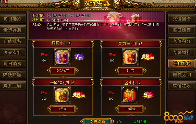 活动内容:活动期间,玩家可花费元宝购买超值折扣礼包,低至3折!温馨提示:典籍刷新按钮刷新所有礼包与折扣。
