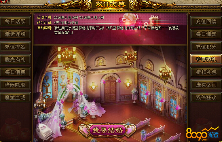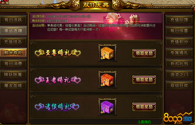 活动内容:单身诚可贵,结婚价更高!活动期间,结婚的玩家成功预约婚礼后即可领取额外对应奖励!每种奖励每天只能领取一次。