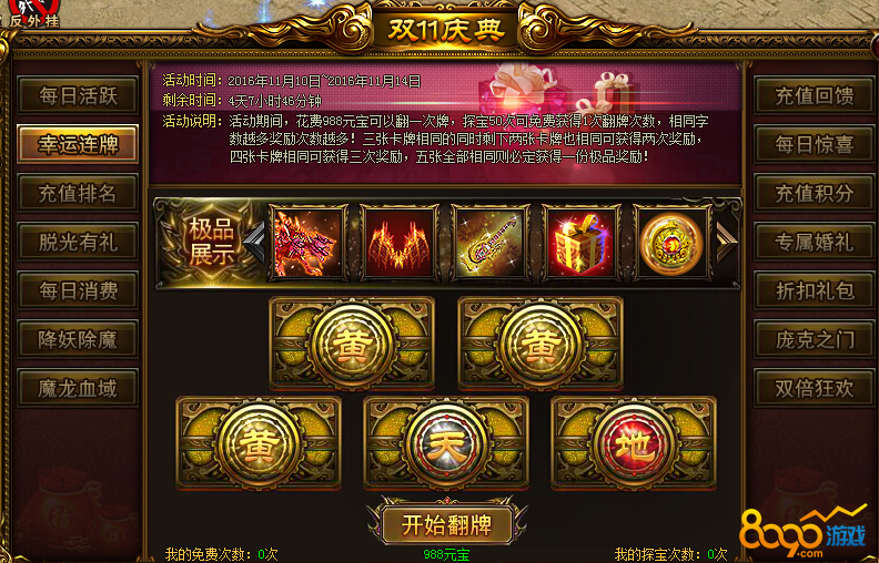 活动内容:活动期间,玩家可花费元998元宝可以翻牌一次,探宝50次可免费获得1次翻牌次数,相同字数越多奖励越多!三张卡牌相同的同时剩下两张卡牌也相同可获得两次奖励,四张卡牌相同可获得三次奖励,五张全部相同则必定获得极品奖励!