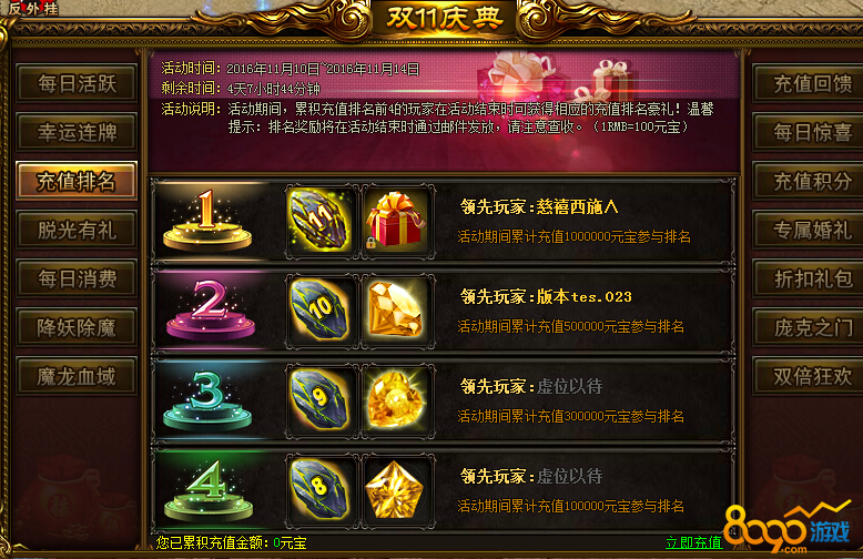 活动内容:活动期间,累计充值排名前4的玩家在活动结束时可获得相应的充值排名豪礼!温馨提示:排名奖励将在活动结束时邮件发放!请留意查收。(1RMB=100元宝)