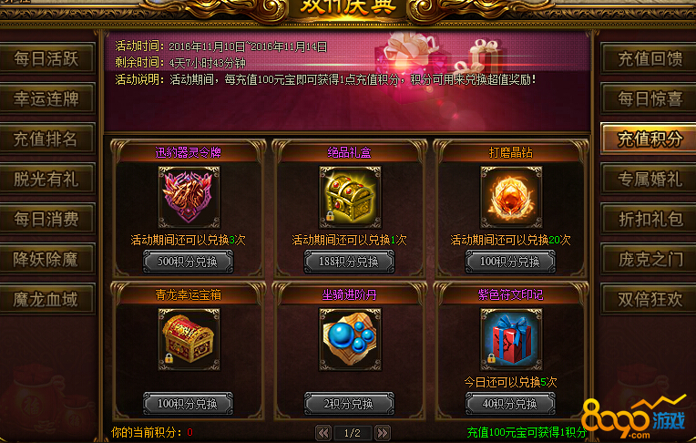 活动内容:活动期间,每充值100元宝即可获得1点充值积分,积分可以用来兑换超值奖励!