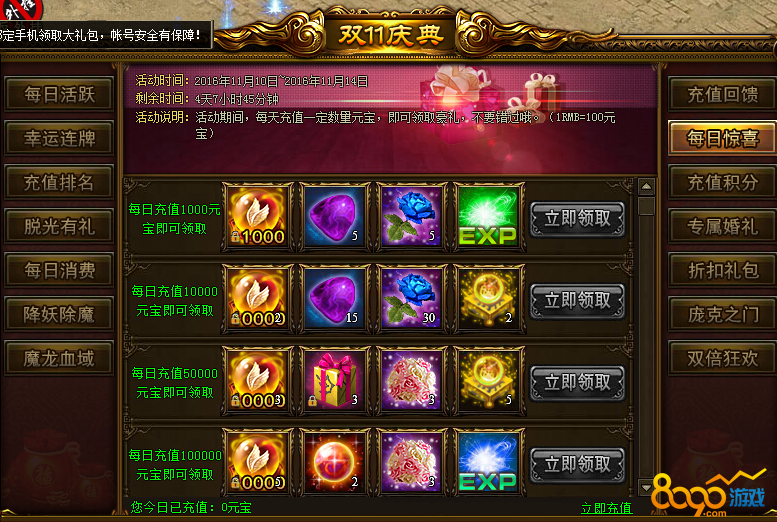活动内容:活动期间,每天充值一定数量的元宝,即可领取豪礼,不要错过哦!