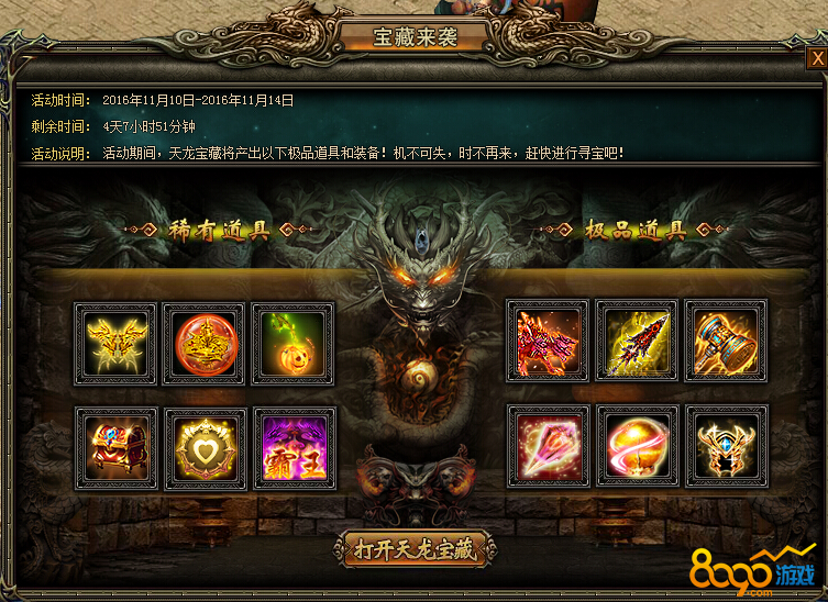 活动内容:活动期间,天龙宝藏将产出鸾凤求凰(幻羽)、菩提琉璃灯(幻灵)、炼狱魔犬(坐骑)、神佑复生以及战天传奇套装等极品装备,快来寻宝吧!