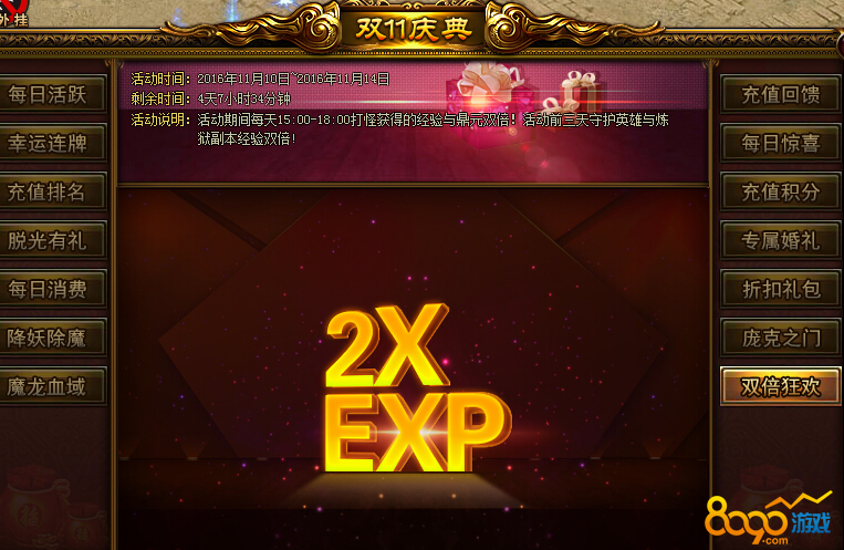 活动内容:活动第一天喝酒双倍,并且每天15:00-18:00打怪获得的经验与鼎元双倍!活动前三天守护英雄与炼狱副本经验双倍。