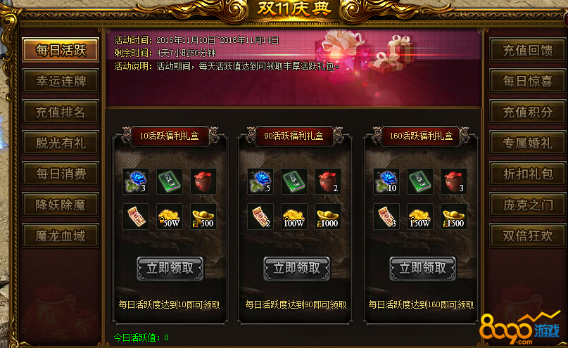 活动内容:活动期间,每天活跃值达到要求即可领取丰厚活跃礼包。