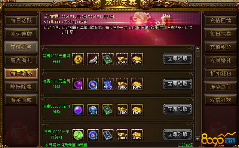 活动内容:活动期间,真情回馈玩家,每天消费一定元宝即可领取超级回馈!消费越多,回馈越丰厚!