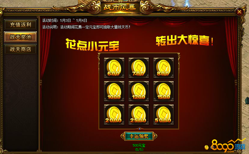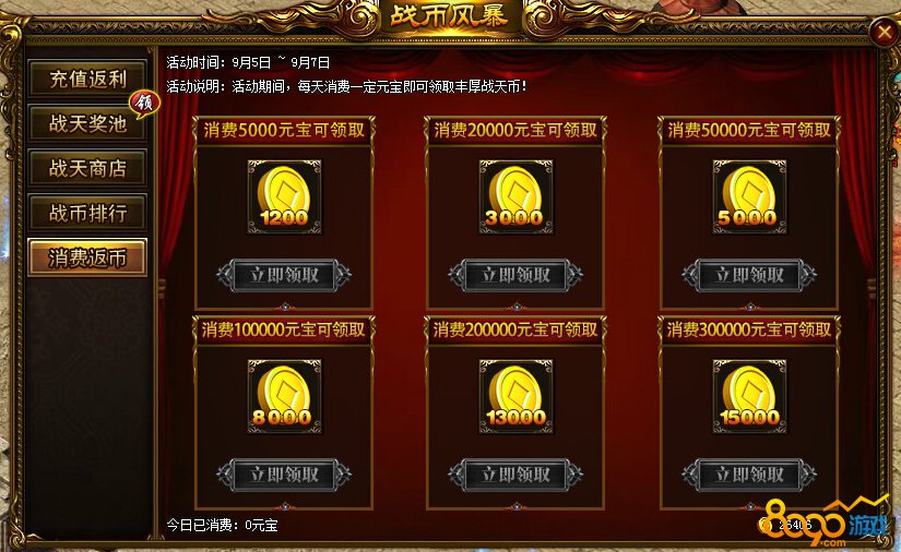 活动说明:活动期间,每天消费一定元宝即可领取丰厚战天币!