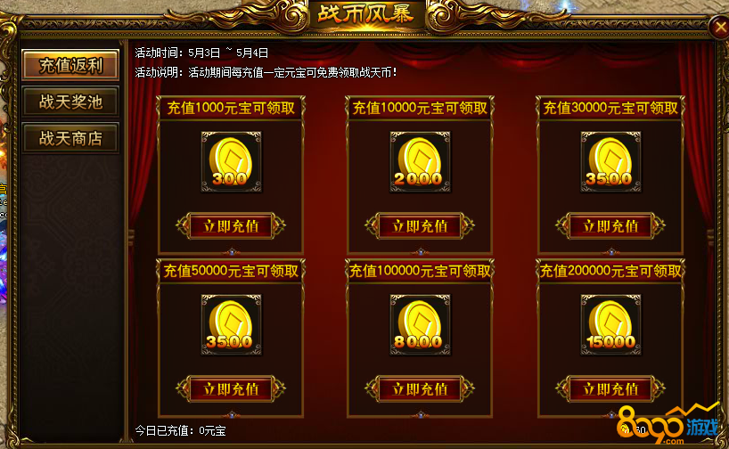 活动内容:活动期间每充值一定元宝可免费领取战天币!