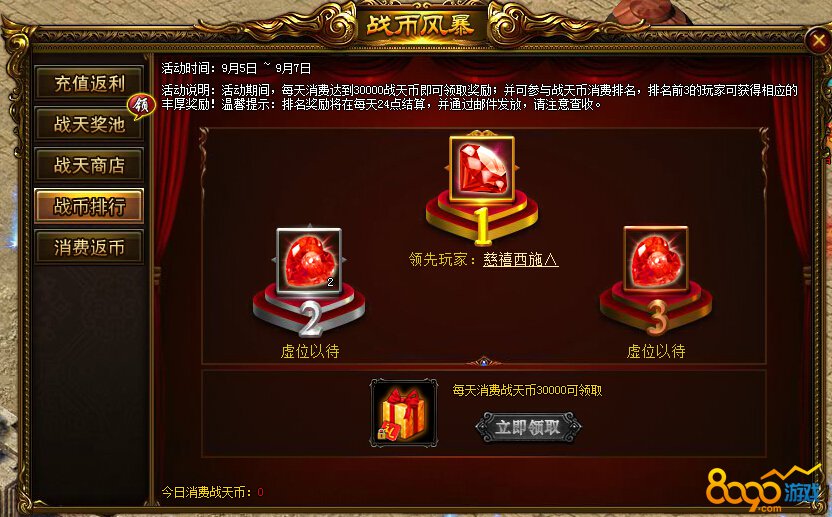 活动内容:活动期间,每天消费达到30000战天币即可领取奖励;并可参与战天币消费排名,排名前3的玩家可获得相应的丰厚奖励!温馨提示:排名奖励在每天24点结算,并通过邮件发放,请注意查收。