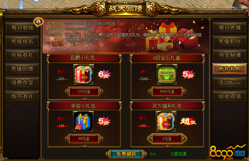 活动内容:活动期间,可花费少量元宝购买超值折扣礼包,低至3折!温馨提示:典籍刷新按钮,刷新所有礼包与折扣。
