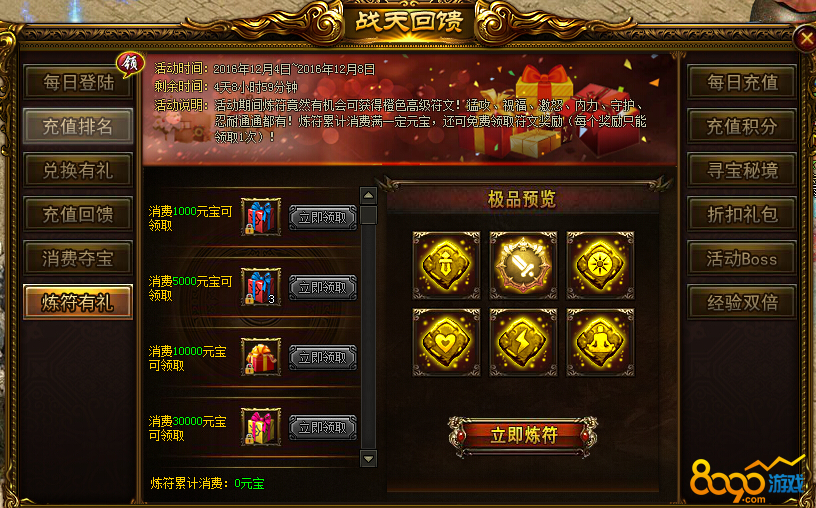 活动内容:活动期间,炼符有机会可获得橙色符文!猛攻、祝福、激怒、内力、守护、忍耐统统都有!炼符累计消费100W元宝,还可免费领取1个橙色符文礼包。