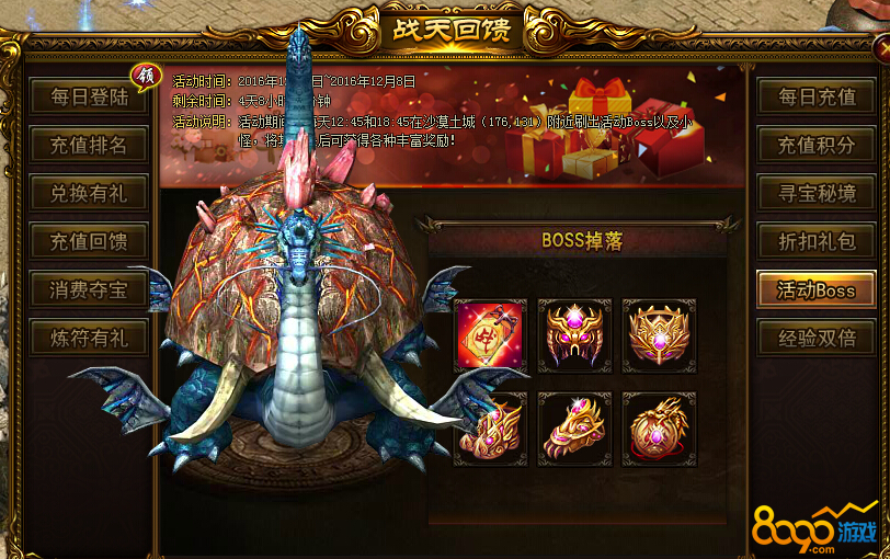 活动内容:活动期间每天12:45和18:45在沙漠土城(176,131)处刷新出活动BOSS以及小怪,将有几率获得各种丰富奖励!