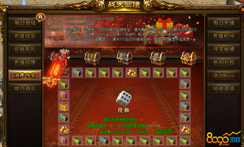 活动内容:活动期间,可使用一定的投纸币投掷夺宝,通关更有丰厚大礼!每天最多可获得5次通关大礼,每消费1000元宝可获得1个投纸币,每天最多获得500投纸币。温馨提示:通关5次后可继续投掷,每天24点充值夺宝进度。