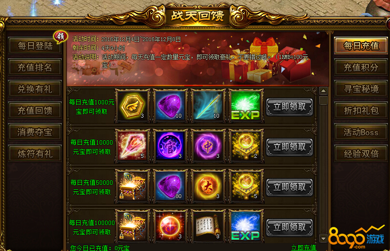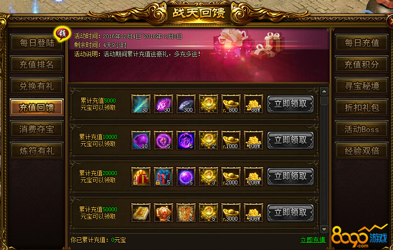 活动内容:活动期间,每天充值一点你给数量元宝,即可领取豪礼,不要错过哦!(1RMB=100元宝)