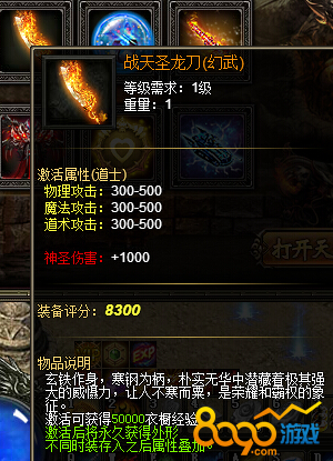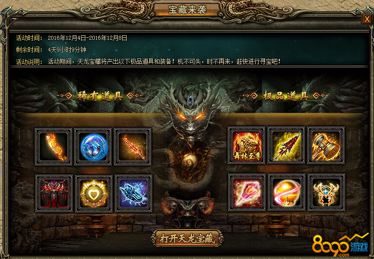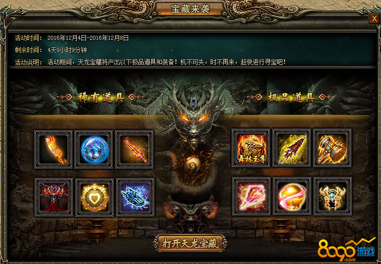 活动内容:活动期间,天龙宝藏进行寻宝将有可能获得战天圣龙刀(幻武)、烈焰流光锏(幻武)、武林至尊(称号)以及战天传奇套装部件等。机不可失,时不再来!