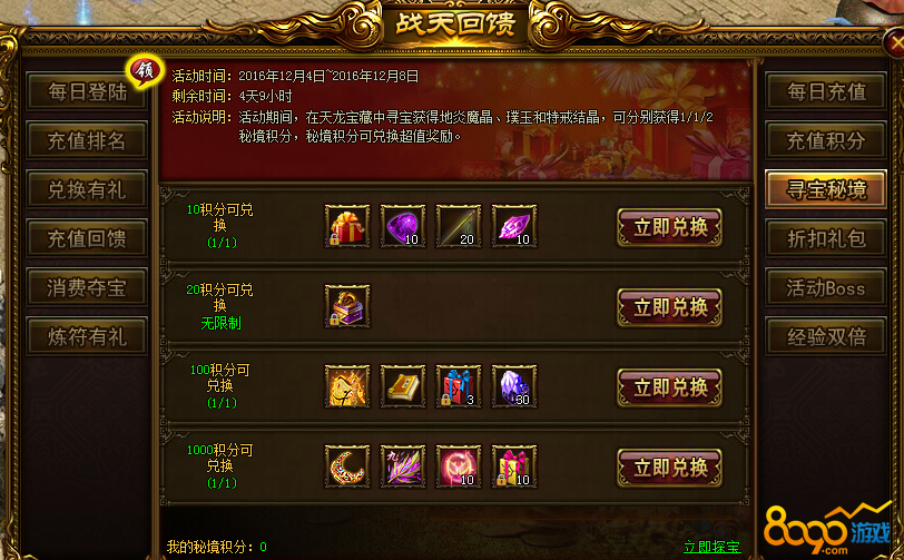 活动内容:活动期间,在天龙宝藏中寻宝获得地炎魔晶、璞玉和特戒结晶,可分别获得1/1/2秘境积分,秘境积分可兑换超值奖励。