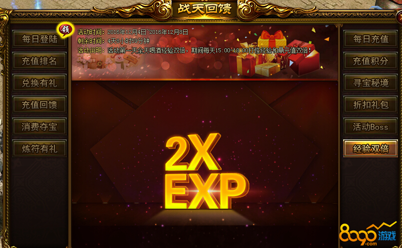 活动内容:活动第一天全天喝酒经验双倍!此外每天15:00-18:00打怪经验和鼎元值双倍!