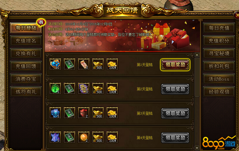 活动内容:活动期间,每天登陆即可领取丰厚奖励。不要忘记领取哦!