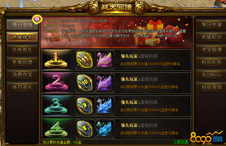 活动内容:活动期间,累计充值排名前4的玩家在活动结束时可获得相应的充值排名豪礼!温馨提示:排名奖励将在活动结束时通过邮件发放,清注意查收。(1RMB=100元宝)