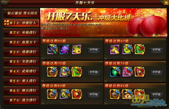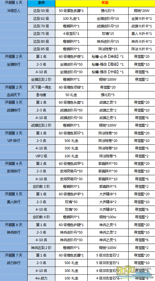 活动内容:活动期间,无论是坐骑、武将、美人还是战力,等级,只要您在规定时间达到条件均可获得超丰厚奖励!达到第一更有巅峰奖励!只要热爱,我们送您高值奖励!