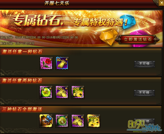 活动内容:活动期间玩家只要激活相应数量钻石即可获得额外奖励!钻石可以带来极大战力及特权加成,还有炫酷特效!至尊王者象征,你绝对不能错过!