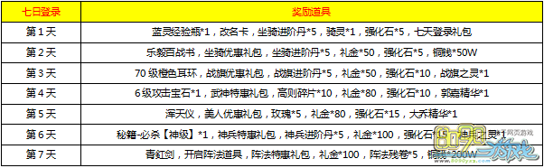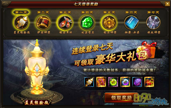 活动内容:连续登录七天,可领取豪华大礼包,累计登录的天数越多,获得的奖励越丰富!