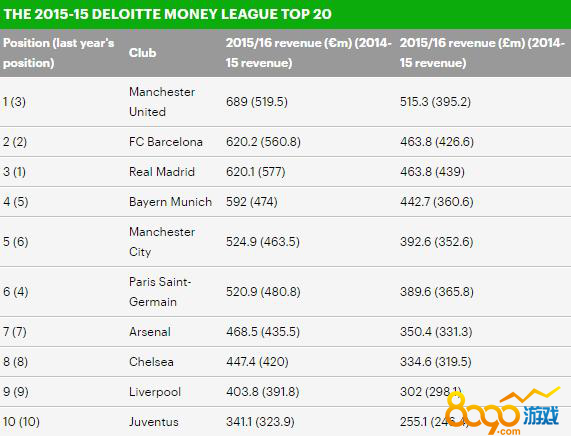 焦点二:俱乐部收入排行榜:曼联居首,英超成最大赢家