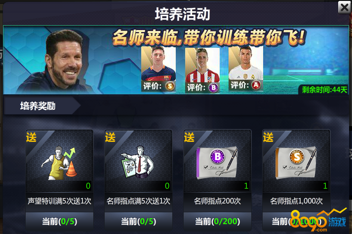 1、活动期间,使用声望值、名师指点培训球员,满5次赠送1次。