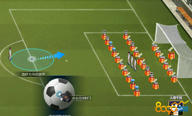 2、 达到要求后可进行任意球射门,射门线路中可获得小礼盒