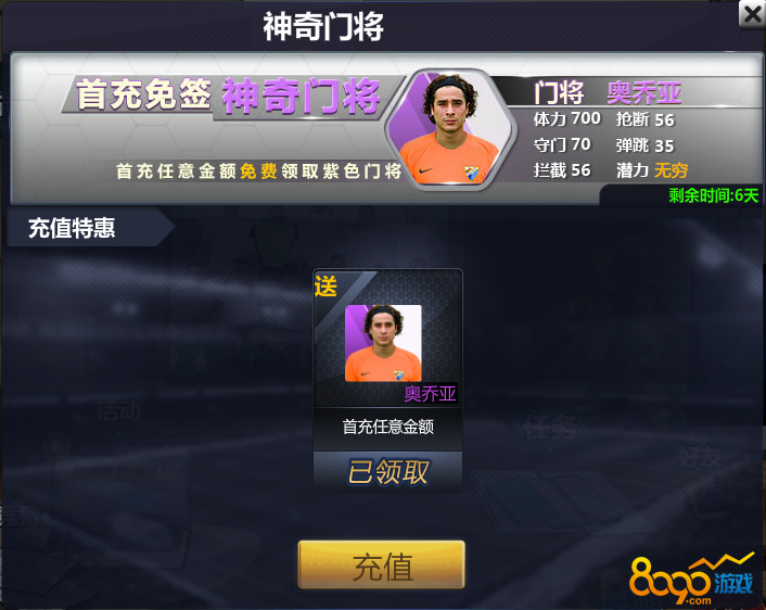 内容:活动期间,首次充值1元即可获得紫色门将“奥乔亚”。