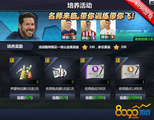 在游戏里,球员培养可是有着活动规则的哦!活动期间,使用声望值、名师指点培训球员,满5次赠送1次哦!