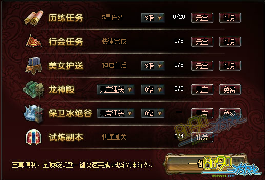 【活动内容】活动期间玩家可以通过活动界面使用元宝或礼券可立即完成每日所有任务、副本,轻松游戏,快乐过年!一键全秒,至尊便利!