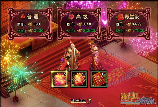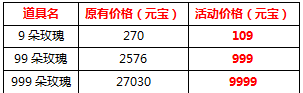 【情人超值中礼包】8888元宝:时装柜提升灵石*88、翅膀柜提升灵石*88、99朵玫瑰*3、经验玉(超)*1