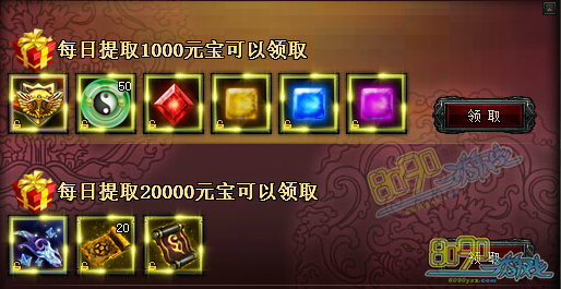每日提取20000元宝以上可获得:冰魂翅膀碎片*1(4个碎片可合成冰魂翅膀),寻宝图*20,3倍经验神符(8小时)*1。
