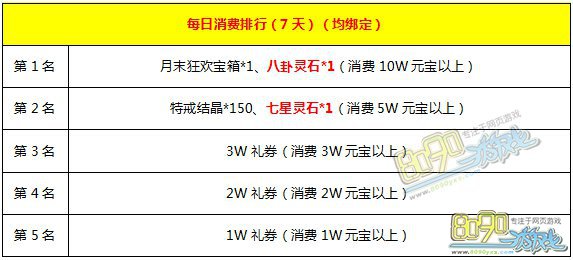 【活动内容】活动期间每天元宝消费排行前5名的玩家可获得丰厚道具奖励!
