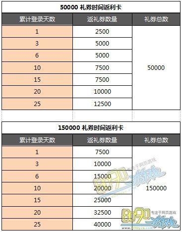 活动期间累计消费达50000 元宝活动结束后即可获得一张150000 礼券时间返利卡;