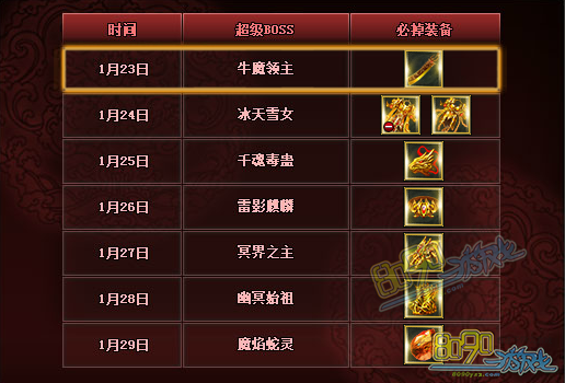 击杀超级BOSS必掉一样高价值道具,击杀精英怪掉落高级装备、礼券等(注:活动时间总共7天)