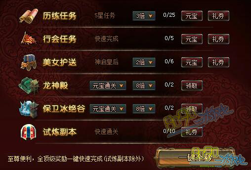 【活动内容】活动期间玩家可以通过活动界面使用元宝或礼券可立即完成每日所有任务、副本,轻松游戏,快乐过年!一键全秒,至尊便利!